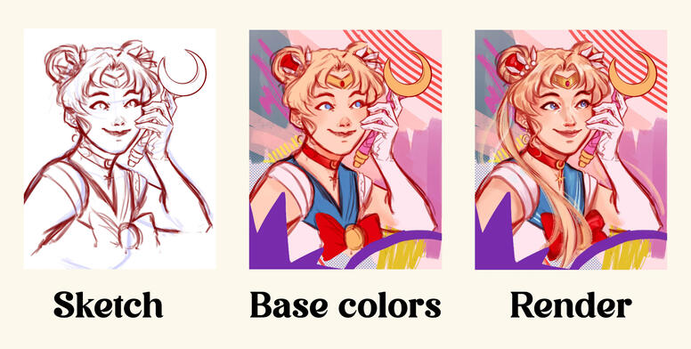 📌 Sketch: Where we’ll discuss if the pose and composition are right or in need of adjustments.